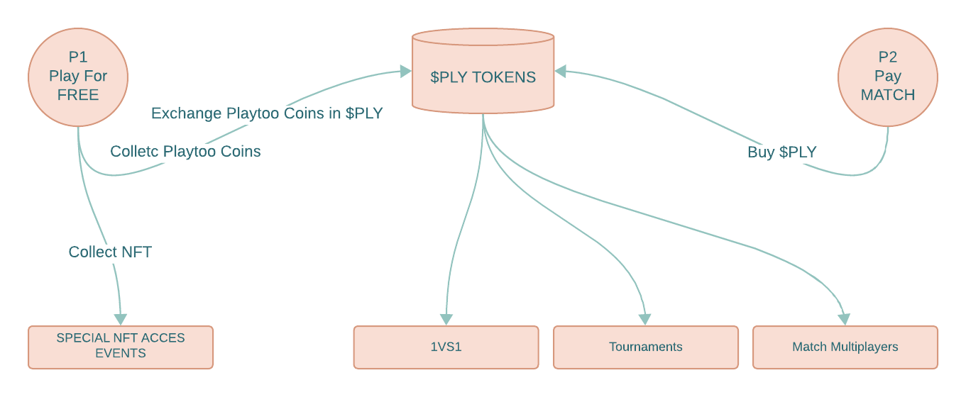 * **$PLY crypto token:** in exchange for Playtoo-coins, or can be purchased